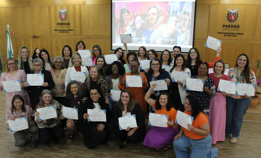 PRESENÇAS – Participaram da solenidade, realizada na Procuradoria-Geral do Estado, em Curitiba, o procurador de Justiça do Ministério Público do Paraná, Olympio de Sá Sotto Maior; a auditora fiscal do Tribunal de Contas do Estado, Adriana Lima Domingos; a deputada estadual Márcia Huçulak; o procurador-geral do Estado, Luciano Borges; a coordenadora do Núcleo de Promoção e Defesa dos Direitos das Mulheres (Nudem) da Defensoria Pública do Paraná, Mariana Martins Nunes; o coordenador de Planejamento Estratégico e Grupos Vulneráveis da Secretaria da Segurança Pública (SESP), coronel Dalton Gean Perovano; a procuradora do Tribunal Regional Eleitoral, Eloisa Helena Machado, e a promotora de Justiça do Ministério Público do Estado do Paraná, Ana Carolina Pinto Franceschi.